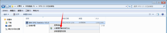 2.打开“SPSS 21 32位安装包”文件夹,鼠标右击“IBM SPSS Statistics V21.0”,选择“以管理员身份运行”