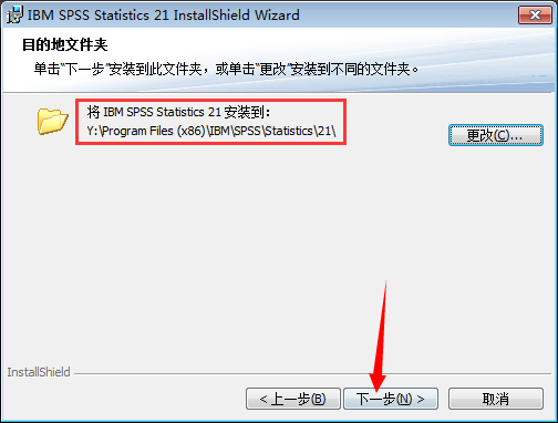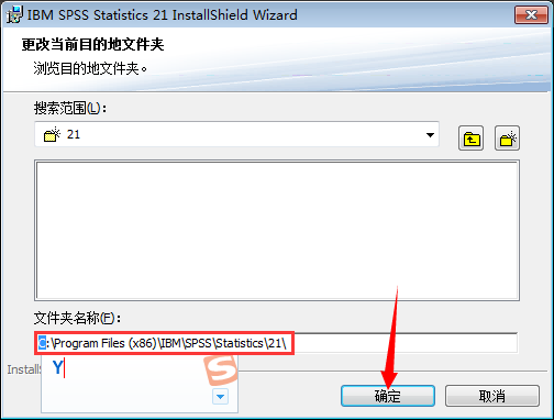 11.选择安装路径,默认安装在 C:\Program Files (x86)\IBM\SPSS\Statistics\21(建议安装在除C盘以外的磁盘上,可以直接将C改成Y,安装到Y盘),然后点击“确定”