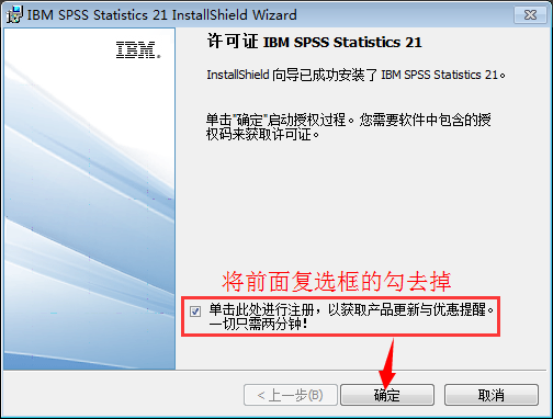 15.将“单击此处进行注册...”前面复选框的勾去掉,然后点击“确定”
